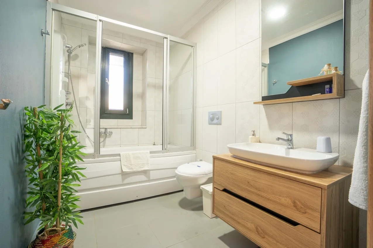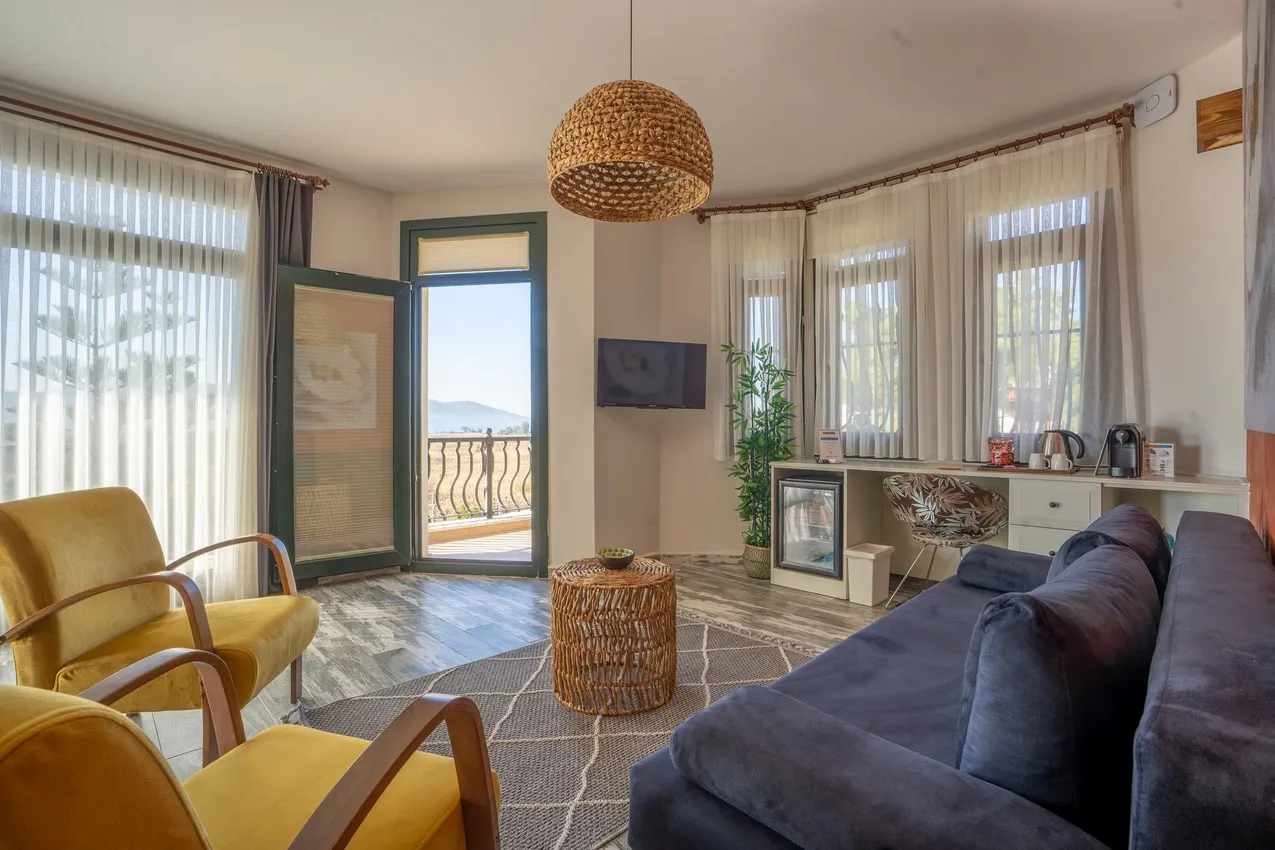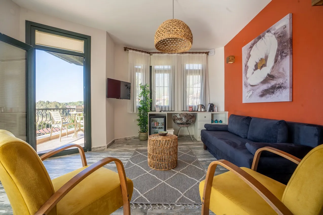 Our 50 square meter room features a double bed and a pull-out sofa, along with two balconies offering sea and pool views. Since it includes a separate dressing room, an extensive wardrobe system, and a work area, it is ideal for long-term stays.